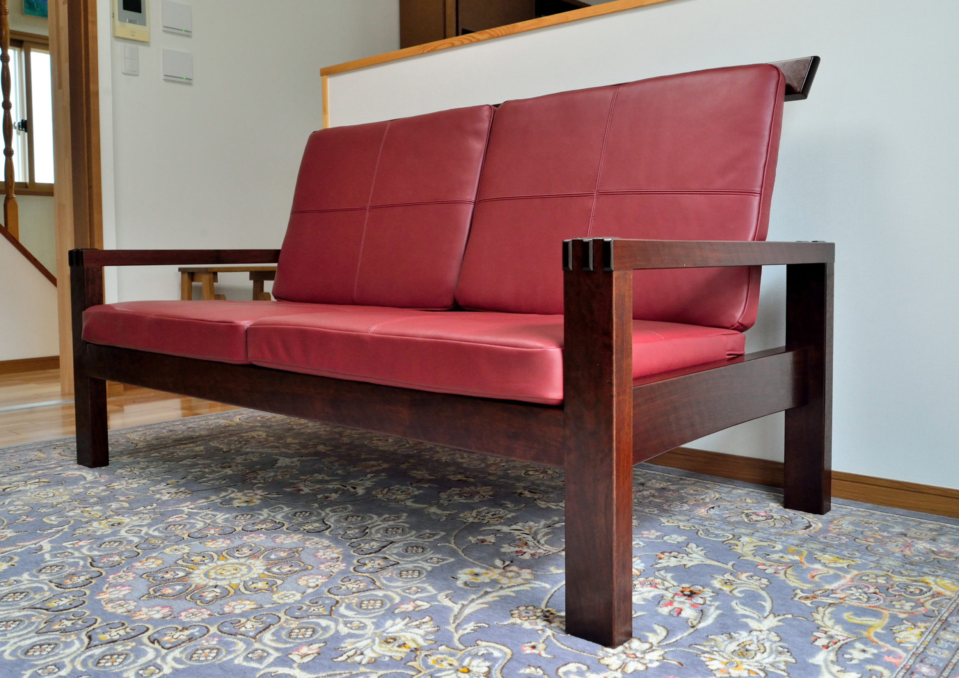 ゆったりと座ることができるクミテ・ソファをお作りさせていただきました。肘部分を前後、精緻な組手にて接合。座面は赤い本革を使用し、あまり沈み込まないような硬めのクッションにしてあります。またクッションを外すと木の座面になっており二重に楽しむことができます。拭漆仕上げで、全面に自作槍ガンナ仕様の彫りあとを残しながら仕上げてあります。ご用意されていたスペースにピタリと納まりました。ありがとうございました。